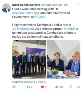 សូមបញ្ជាក់ថា លោក Marcos Athias Neto បានត្រូវបានអនុញ្ញាតជួបពិភាក្សាការងារជាមួយ ឯកឧត្តមបណ្ឌិត អ៊ាង សុផល្លែត រដ្ឋមន្ត្រីក្រសួងបរិស្ថាន ថ្ងៃទី២០ ខែវិច្ឆិកា ឆ្នាំ២០២៤ ក្នុងអំឡុងសន្និសីទបណ្តាភាគីលើកទី២៩ UNFCCC នាទីក្រុងបាគូ ប្រទេសអាសែបៃហ្សង់ នាទីក្រុងបាគូ ប្រទេសអាស៊ែរបៃស្សង់។